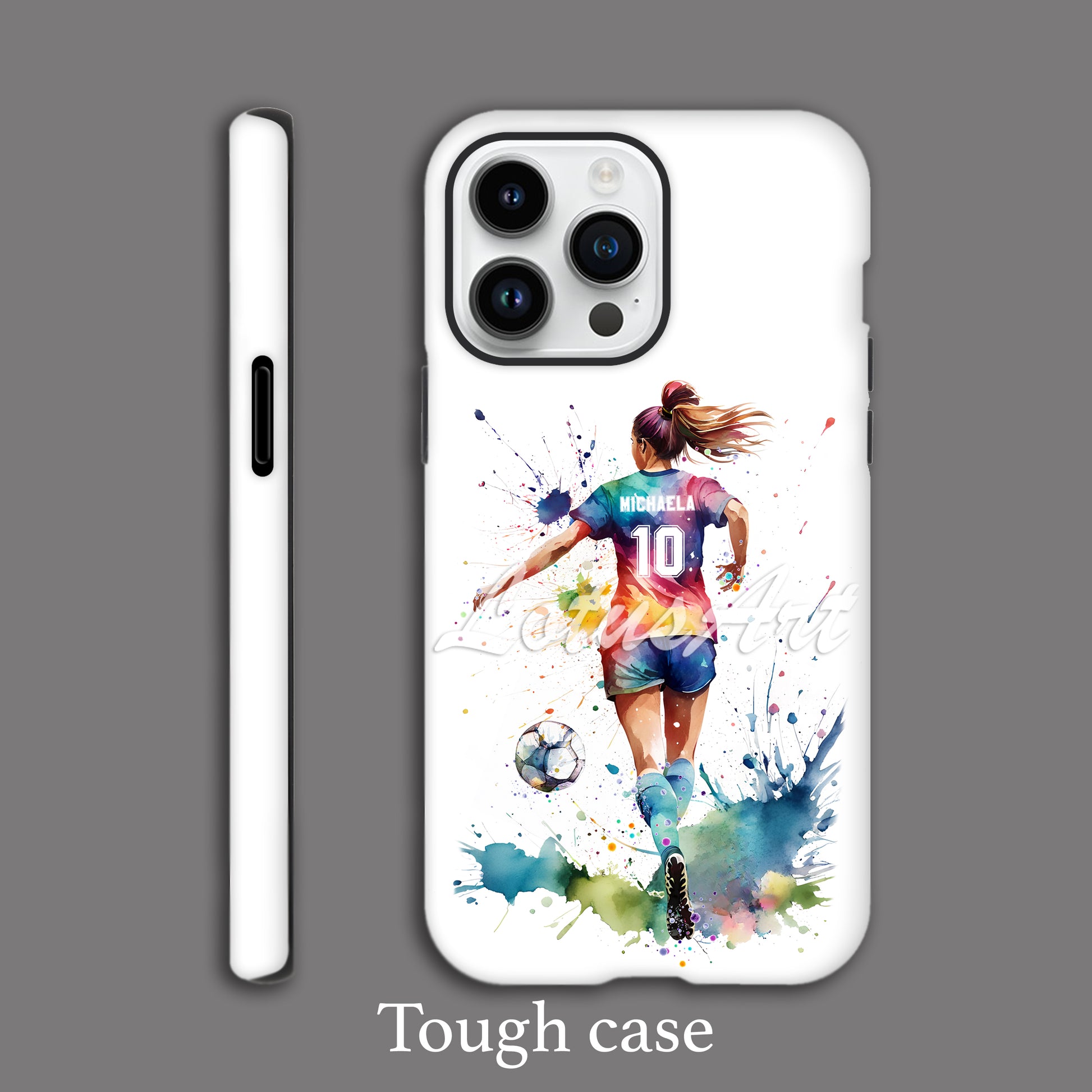 Show off her passion with this personalized soccer girl phone case! Featuring a dynamic watercolor design, this case is the perfect soccer gift for any player. Easily customize it with her name and jersey number to create a unique custom phone case. The durable design protects her device (available for iPhone and Samsung models) while celebrating her sport. An essential accessory and a fantastic piece of sports memorabilia for a dedicated athlete.